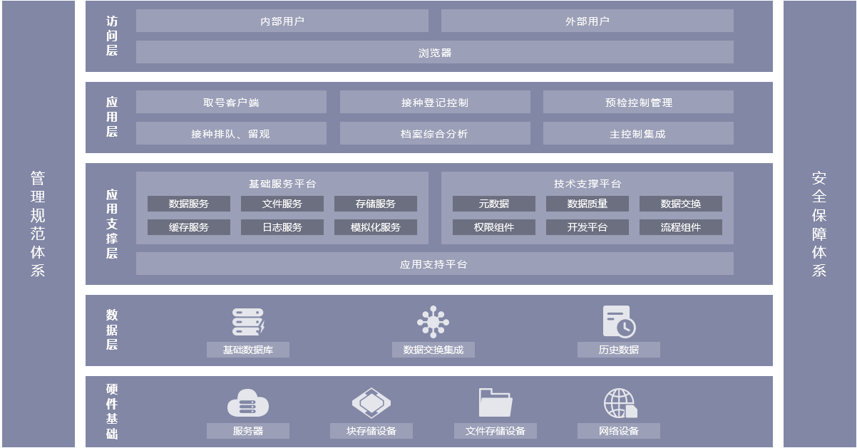 构建预防接种门诊全流程信息管理系统,为实现儿童预防接种全流程质量控制,打造和谐门诊环境,提高综合服务水平提供支撑。支持取号、候诊、登记、候诊、接种、留观等环节无缝对接及管理, 考虑各种突发情况的应急处理方案,保证流程的规范性和质量管理,数据的准确性、完整性、连续性。同时为后期的数据综合分析奠定基础,为解决医患矛盾提供科学依据。