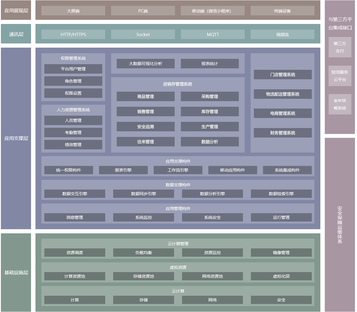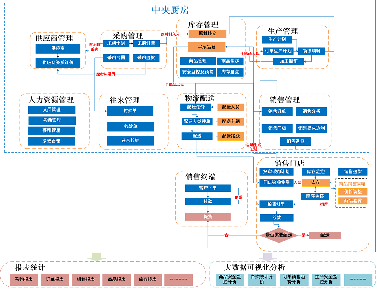 初步将系统划分为进销存管理、门店管理、物流配送管理、报表统计、大数据可视化分析等模块。融合贯穿物资流、信息流、资金流、客户流为一体,管理中央厨房、销售门店日常的进销存业务、物流配送、人力资源等核心业务。依托主线数据流,进行报表统计分析、大数据可视化分析,总体架构如下图所示: